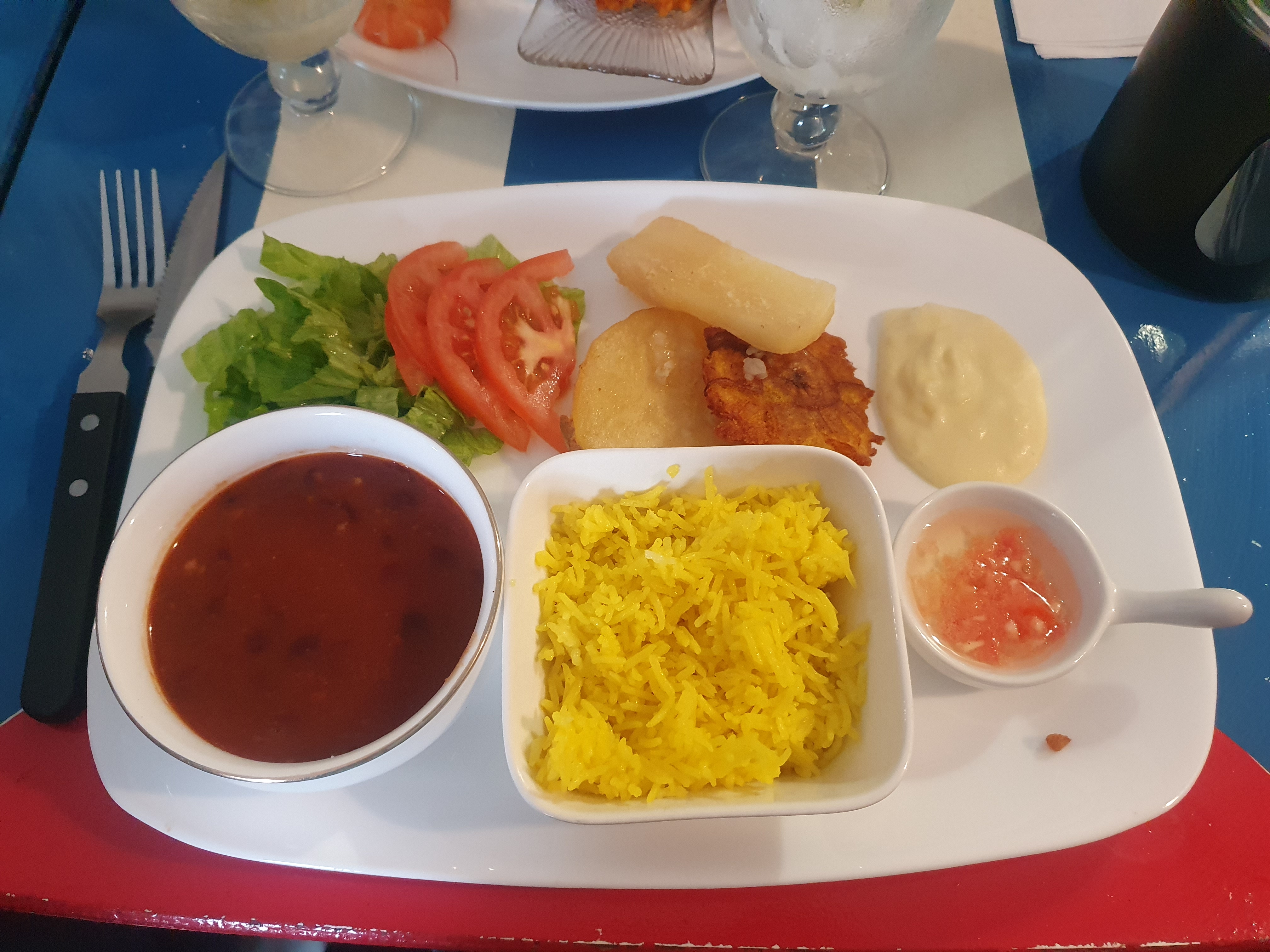 C'est dommage je me faisais une joie de découvrir la gastronomie cubaine. On ne me propose pas de plats, je dois faire mon choix seule en m'aidant de Google pour avoir une idée des plats. L'entrée est servie, 5mn après la patronne me dit que je prends trop de temps et me ramène donc le plat. Le plat : Cuba Maine, 25€ l'assiette effiloché de bœuf, tomate, manioc, riz et j'ai oublié le nom du reste. Je découvre d'abord les accompagnements, de nouvelles saveurs, pas très à mon goût, c'est fade, pâteux, le riz est léger mais très sec. Une fois accompagné de la sauce maison, c'est meilleur et que dire de l'effiloché ?! La première fourchette me semble bonne mais très vite le côté salé vient gâcher la totalité du plat, que je ne peux pas finir. Le restaurant ferme à 23h soit 10 mn plus tard, je n'ose pas demander de dessert même lorsqu'il est proposé, derrière le sourire de la patronne on sent la proposition forcée. La note pour 2 est aussi salée que le boeuf, 2 entrées, 2 plats, 2 jus de fruits 77€... Je n'aime pas rester sur une mauvaise idée, je retenterai peut être mais sur un service du midi et tôt. La fin de semaine et notre heure d'arrivée 21h50 à dû jouer en notre défaveur.