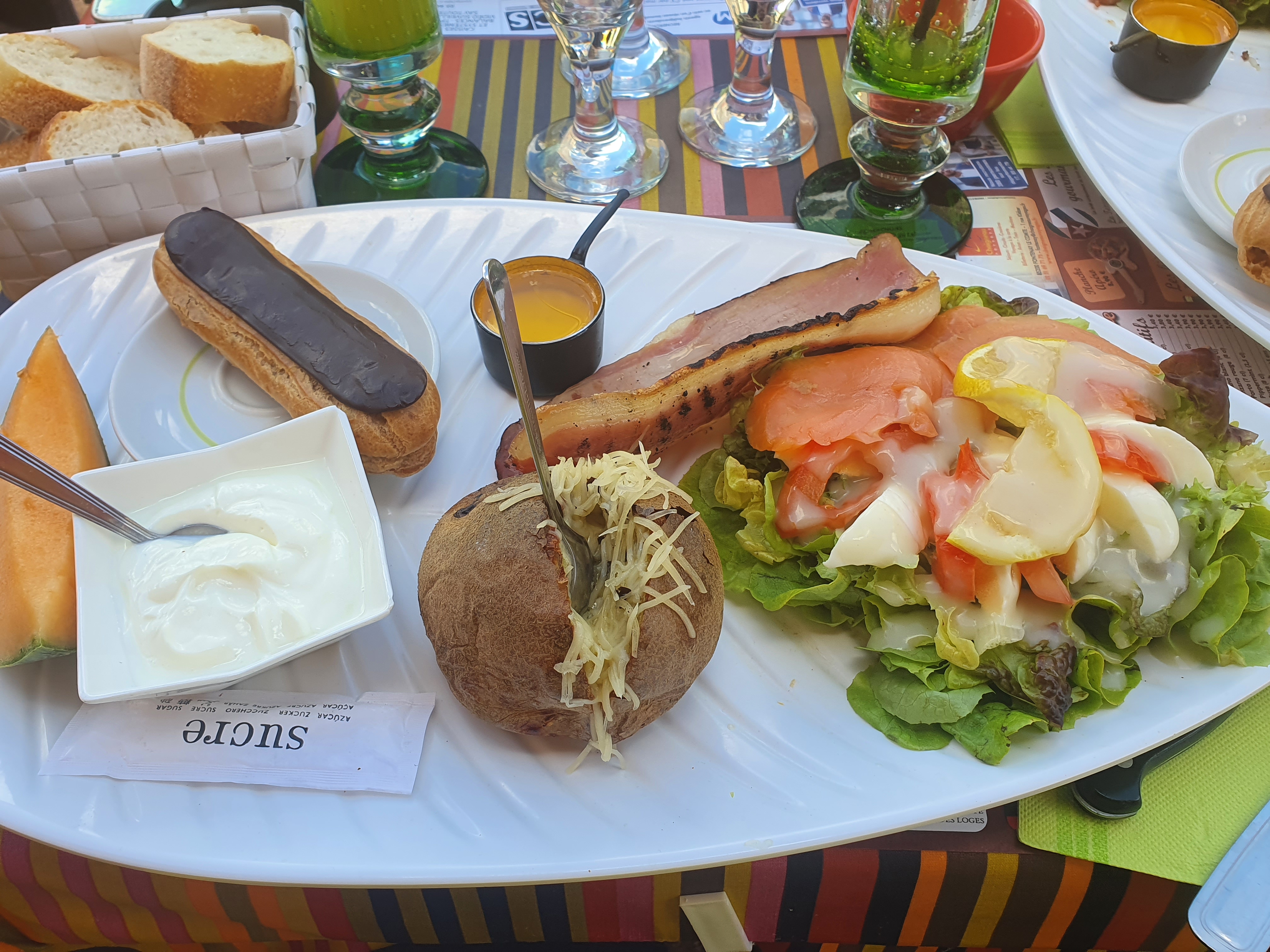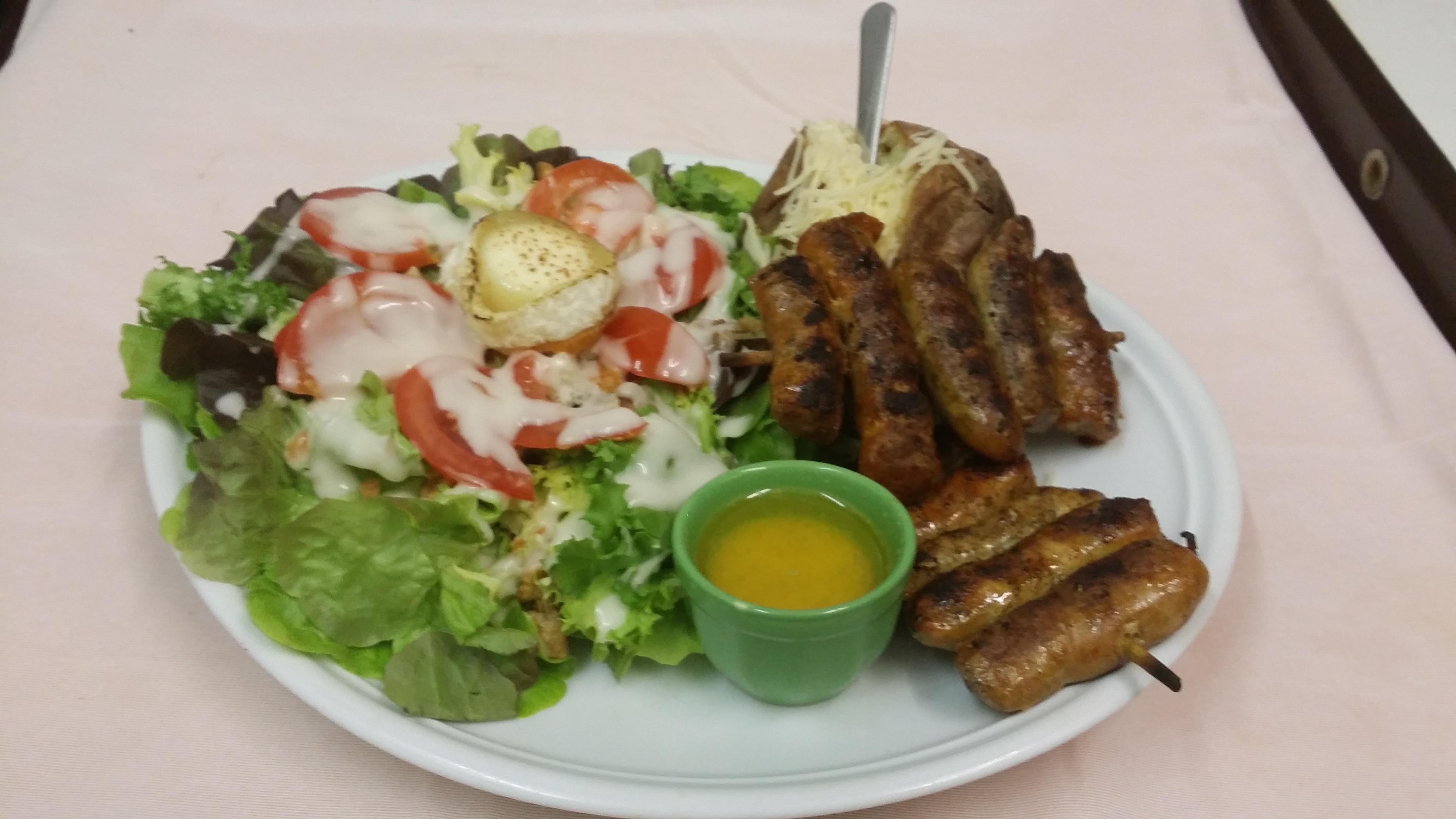 Plat copieux et équilibré avec un magnifique salade composée, un pomme de terre au four et sa sauce, une brochette de viande et 3 desserts ( un fromage blanc, un crêpe et un gros morceau de melon). Tout ça pour moins de 13 euros avec un service agréable servi en terrasse sur un petite place toute calme. Parfait.